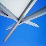 Rotary Point: A series of steel beams delicately touch to form and define space. The triangular plan is reinforced three dimensionally with overlapping diagonal bracing and a translucent fabric roof.