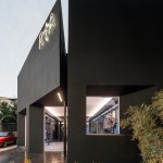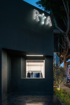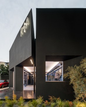 The flagship store of Road to Awe (RtA) is as streetwise as the clothes produced by this Los Angeles fashion brand. Los Angeles architect Dan Brunn, AIA, created a complex, dream‐like space with geometric precision, meditative sensations, and positive/negative dualities. Graced with street exposure from two sides, the streamlined boutique proclaims its variably angled black façades to the public. Dan Brunn Architecture renovated a 1,200‐square‐foot, 1970s building to create the new retail space, maintaining its footprint, but completely reshaping its geometry to create a more cohesive, sculptural experience. Inside, the 10‐foot‐tall space features concrete floors, black mirrors, wood surfaces, and blackened steel beams, creating a minimalist backdrop to the edgy fashion. An interior garden contributes calm and brings a mannered sense of nature into the scene.