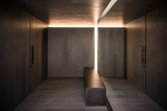 At the rear of the store, a fitting room and a bathroom flank a generous waiting area with a long cantilevered blackened steel bench where friends can sit while shoppers try on clothes. Not merely a changing/waiting area, this nook serves as a catwalk for customers, as the large fitting room door swings open to reveal a nine‐foot by eight‐foot mirror. The space is completely clad in ash on the floor, ceiling, and walls to unify this area. A backlit “T”—formed by slots and recesses in the wood surfaces—takes on the asymmetry of RtA’s logo lower‐case letter, further symbolizing the brand.