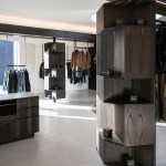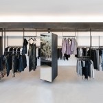 Merchandise surrounds visitors in display areas stretching along the sides of the 30‐foot‐by‐40‐foot space. Clothing is hung on a custom hardware system of four planes of suspended roller tracks set into both the white soffits and the blackened steel beams. Hangers easily slide to reveal the layers of merchandise and maintain the richness and depth of space integral to the design. Custom‐designed wooden cases extending to the beams rotate to reveal mirrors or positive/negative insets that display for‐sale books and accessories.