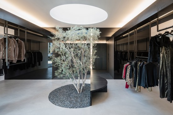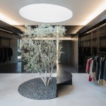 The interior of the store is organized around the central garden—a circular contemplative area accented by a single tree surrounded by grass and a curved wooden bench. The tree is planted under a skylight that mirrors the turf/bench circle and filters sunshine into the space. This introduction of nature, created by Japanese landscape designer Hitoshi Kitajima of Kaisei‐en, is meant to represent LA’s Asian influences and provide the “awe” represented by the fashion brand.