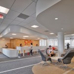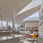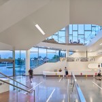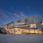 The Roberts Pavilion is itself a nimble building. It bends and warps, slants, rises, and sinks with movement and expansive light. To meet the challenges of a compact site, the architects sank the central arena below grade and placed other functions around the edges. The experience of the building is one of lightness and light. Lightness because it appears to hover above the ground plane on a ring of light produced by twelve-foot high sheets of glass on all sides. Light because it is a study in how to optimize daylighting and connects to the world outside with views clear through and from almost any vantage point. For JFAK, light is as much a substance to build with as any other material.