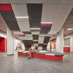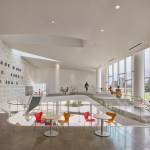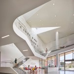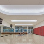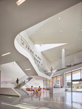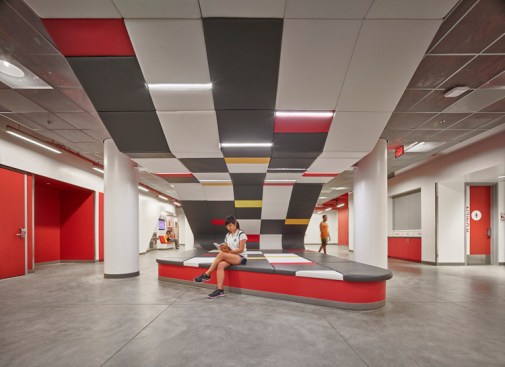 On the exterior, the building is skinned in terracotta. A cladding system more common in Europe, the owners liked it for its texture and also its malleability, which gives it lightness. Red and yellow accents dance around the faces of the building to indicate school and team colors. Adjacent to the main entrance, a welcoming landscape stair brings people up to the second level and provides terraced seating. Inside the expansive lobby, a double-height, figured wall rises above the dramatic sculptural interior stair. Taking cues from Jasper John’s white-on-white paintings, the wall features letters in relief that, when put together, spell out the name of the school as well as the school’s three core values: Courage. Creativity. Empathy.