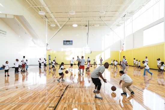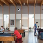 The design also incorporates an existing 7,000 square foot former garden center building as a dedicated teen center serving kids aged 13-18. The gabled steel of the existing structure’s roof line continues into the gym as a design feature. The teen center includes a music recording studio, computer labs, an “innovation station”, and a suspended “night sky” ceiling feature within the pitched roof of the reused structure that distinguishes it from the separate junior center (ages 6-12).