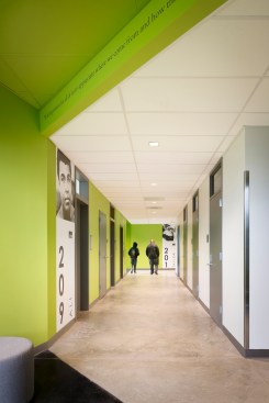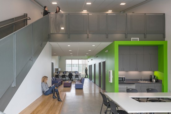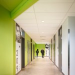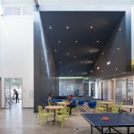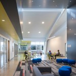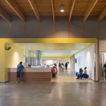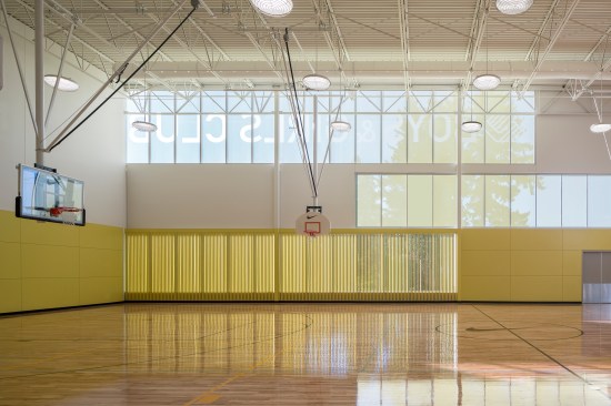The design of the Club balances safe outdoor spaces, visual transparency, and clear sightlines for safety with attractive, “grown-up” design. Protected ground floor spaces promote security; clerestory windows and skylights bring in additional daylight. The gym and classrooms on the ground floor feature fritted glass with supergraphics that allow views out but not in from the outside. A ribbon of yellow painted walls and ceilings leads members though the building and connects the major spaces, signaling to members that they are a part of a unified community.