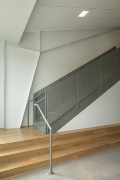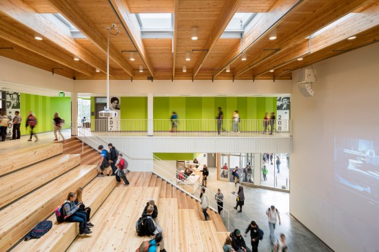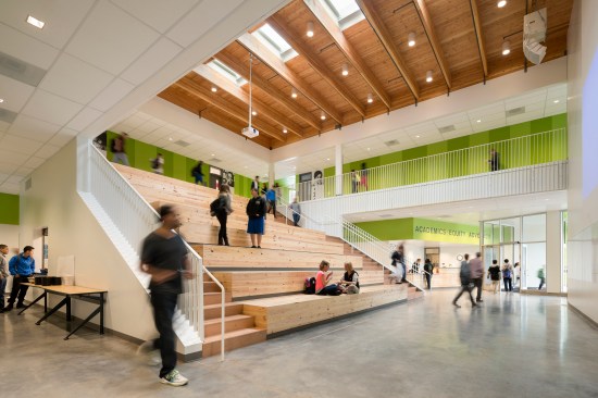 Open School East is an innovative college-prep school that prepares students who have struggled in traditional public school for success in college, career, and community. The design of the building reinforces the school’s model of support and openness: it provides eleven classrooms, two science labs, an art studio, and administrative spaces arranged on two floors around a double-height gathering space. A central, cascading bleacher stair of reclaimed wood anchors both floors and allows the school to come together as a community. The volumes that house the classrooms are shifted along the edges of the central space, creating informal seating nooks off the corridors at the building’s four corners. These spaces bring daylight into the hallways and accommodate small-group instruction, individual tutoring, and informal check-ins.