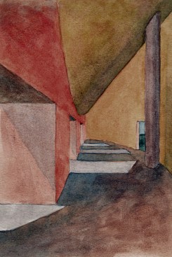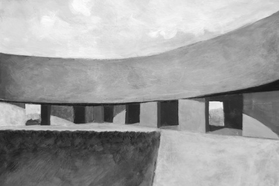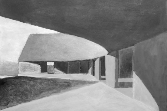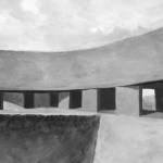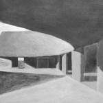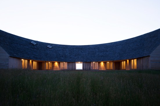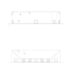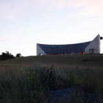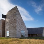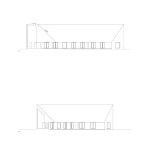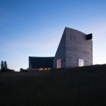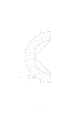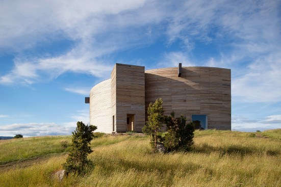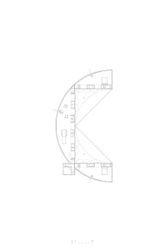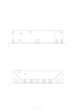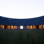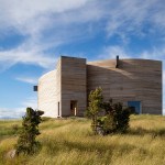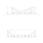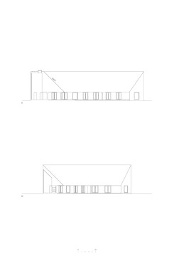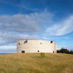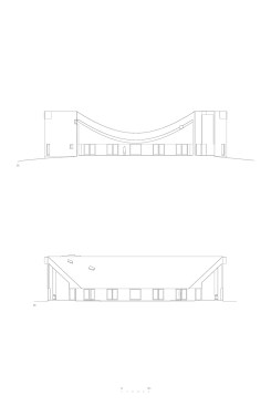 Sitting atop a pleasant and continuous evergreen meadow, overlooking the inner sea of Chiloe Island, this is both a half and a double house. Half, because it is the interrupted encounter between a cone and a cylinder. Double, because the subtraction of a rectangular form at the base of the previous figures generates a pair of equivalent rooms at the extremes of a linear sequence, one facing the direct yellow sun and the other the indirect and blue one. There is a large space contained by these parallel rooms; a partially paved court that is protected from the rain in two covered corners and from the strong winds on three sides. These sides are conceived as functional widths, as emptied thick walls containing all the domestic facilities. The presence of the whole curved case is rather asymmetrical: from one side it stands as a massive and hermetic fortified refuge, from the other it appears as a large pitched roof almost without supporting walls.