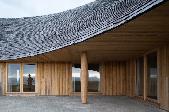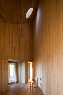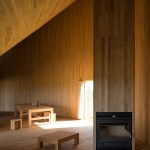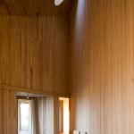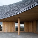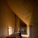 The entire construction is made out of local timber. The structure is defined by the polar array of forty-five rigid frames. While walls and ceilings are clad with boards, a traditional thin wooden shingle covers the conic roof.