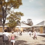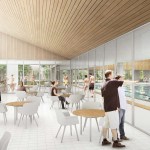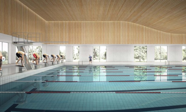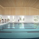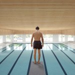 The visual relation ensures a good overview for the lifeguards and parents watching their children – while giving visitors a peak into all the activities that the swimming bath has to offer. The horizontal roof element also frames the landscape visually integrating the surrounding into a spatial experience with the swim hall, where diverse fauna becomes a backdrop of changing color and light with seasonal change. During autumn, hues of red, yellow and orange will color the interior spaces, whilst in winter, the leafless trees maximizes the amount of ambient light. In spring and summer the surrounding trees offer natural shading, using the trees’ dense canopy to diffuse excess light into the swimming bath.