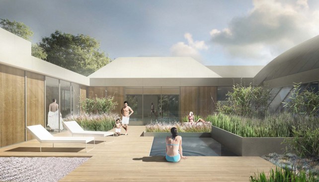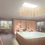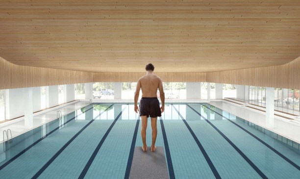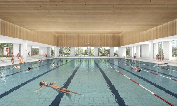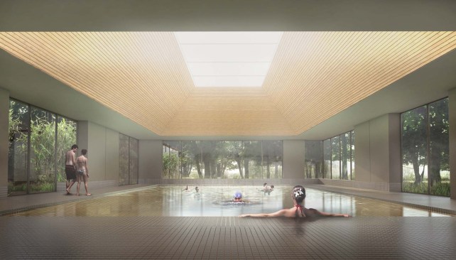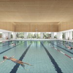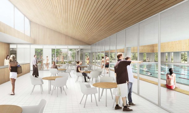 We propose a diverse roof element that ties the entire complex – new and existing – into a cohesive architectural composition. A horizontal window band will frame the landscape whilst creating a strong visual connection between the exterior and interior water space. A series of green courtyards will enhance the experience by bringing daylight and nature into the heart of the swimming bath.