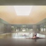 Apart from the aesthetic and spatial qualities, the courtyards also organize the internal spaces to allow a minimum of two access points to each water zone, which creates a flow concept that allows a flexible segmentation of the swimming bath. In doing so, a swimming tournament in the 50m pool can run alongside a children’s party in another area without disturbing the tranquil atmosphere of the ‘wellness space’. It also allows for maintenance in isolated areas while the rest of swimming activities remains uninterrupted.