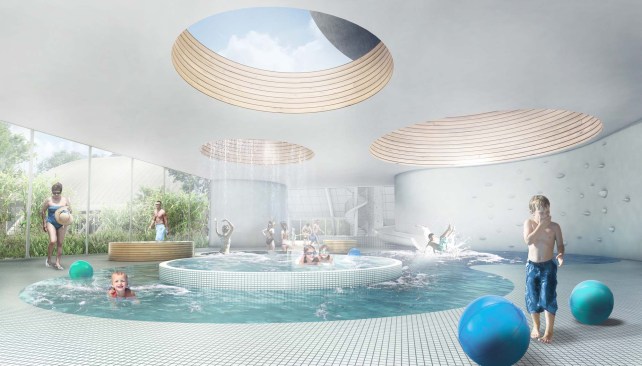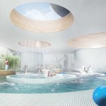 Whilst the courtyards organizes the plan layout, the roof element form vertical spatial differentiation. The roof element covers the entire complex – new and existing – but folds, extrudes and shifts up to create skylights and specific spatial qualities in relation to each program and swimming pool. The different heights, wooden ceilings and roof shapes together with the water and daylight creates unique identities and spatial atmospheres for each zone. Above the 50m swimming pool, a large extruded volume creates a vast space for large events that also appears calm for daily routines of athletes using the pool. Above the activity pools, a series of large circular skylights underlines the playful nature of the space while providing abundant daylight for the kids below. Above the hot water pool, a pyramid shaped roof with a translucent skylight creates a tranquil space, enhanced by the 180-degree view to the landscape. Above the café area, a monopitched roof diffuses northern light into the building and view to the monumental water tower.