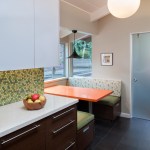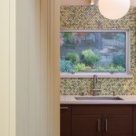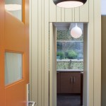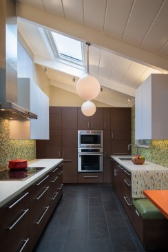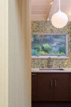 This newly married couple were combining households and wanted to remodel the husband’s house. The wife, a fine art photographer who specializes in documenting domestic scenes, was not afraid of color. She wanted a lively and dynamic color scheme to energize the somewhat mundane, slightly-worn ranch-style house. Choosing vibrant orange countertops, acid green mosaic backsplash tile, walnut cabinetry, colorful fabrics, and Flos light fixtures, pays homage to the mid-century, but with an updated, knowing playful eye. A hidden pivot door clad in a random board pattern “hides” the problem of seeing into the kitchen upon entering the house. In contrast, the master bath is a sea of blue glass and ethereal water colors. Serene, calm, and a perfect place of refuge after a stressful day at work.
