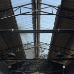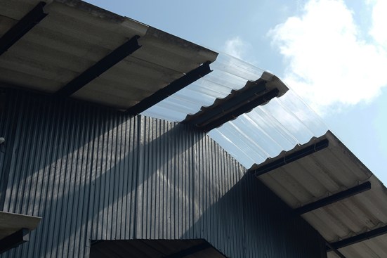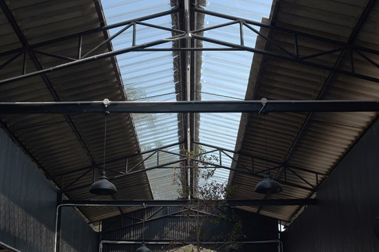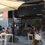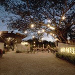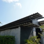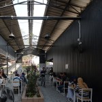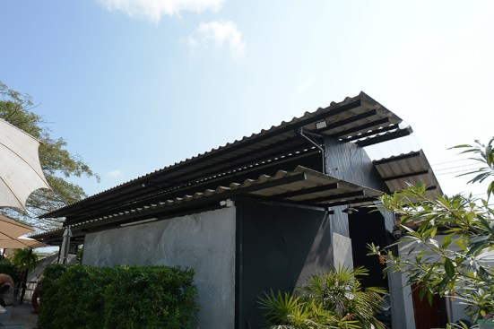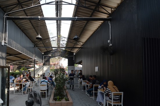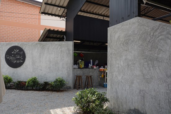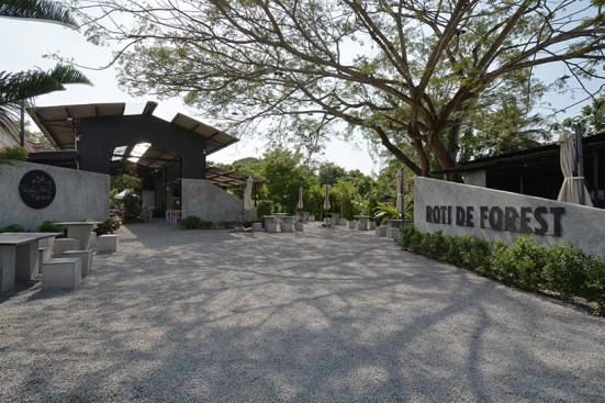 Since this building was car inspection center, there was a hole in middle for checking the suspension of car and be changed this hole to plant trees in the middle to increase shadier inside the building. The tiles at middle of the roof were replaced with polycarbonate roof which allows the light into the building to increase brighter and benefit for trees in the middle. The original equipment storage was changed to a kitchen next of Roti’s bar but It was hided behind metal sheet wall. It had a metal sheet door which when door closed, It look same piece. Black color and vertical lines texture metal sheet make the building does not look too wide. The original office center was changed to billing area because this position is the middle of site for conveniently billing in every position in site , divided some areas into prayer areas for customers who the most are Muslim that will separate the male and female sections according to religious regulations, smashed some original walls in front of billing area to make the building look more airy and better ventilation and relate with green space outside. For the bathroom applied new white walls, exterior and interior to look new and clean more. For outside, some trees had been removed to increase the free space resulting be a wide court at entrance to allow space for people to take photos and check in with the front sign that is consistent with modern lifestyle. In addition, overgrown grasses were removed and replaced with grey pebble to improve the brightness of the area. At the sample time, the grey pebble was also poured inside the restaurant which was original concrete floor to connect with outside of restaurant. But the disadvantage that if running fast,it may cause dust to spread resulting people being more careful when walking to give walking slowly not in a hurry that correspond back to the atmosphere of recreation desired. Interior chairs and tables were made from a white steel frame and wood designed to be shaped and the material lightly look to enhance the contrast with black metal sheets. And bare cement walls whereas exterior cube chairs and tables were produced from bare cement with solid shape to enhance the contrast with the green space around the restaurant and resistant to weather outside well .In greenspace side used as bamboo fences to keep in harmony with nature by hanging decorative lights for night. Hanging decorative lights on the big tree in front made this site bright prominently at night from the road. In addition, the color of light used in the restaurant are intentionally designed to make our menus look more appealing and tastier.