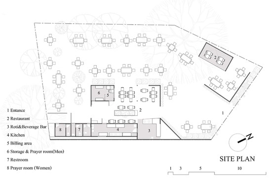 Pattani is a well-known province as the land of multicultural society in southern Thailand that Thais, Malays and Chinese are living together. However, Pattani has suffered from the violent situation which has had a huge impact on economy and tourist industry. Foods in Pattani are unique and has strong influences from Malay and Indian cuisines. Roti is the famous local food, especially for breakfast and dinner. Many roti shops are just stalls and generally located on the footpath. Moreover, there is no roti restaurant which present modern architecture. Therefore, an idea to build a new roti restaurant has risen. We found the suitable location which is suitable to be restaurant. Many years ago, this place was car inspection center and has a big warehouse before it was renovated for restaurant. When the area was abandoned for many years, the many trees has been grown up and it has a prominent feature with a large tree in front. Due to the forest-like area, the restaurant is named as ‘Roti de Forest’, which means roti in the forest. According to the atmosphere around restaurant, the big warehouse and tree of this place are included in logo of restaurant to communicate that we renovate and develop this project from the context of this site every step.