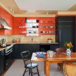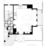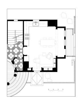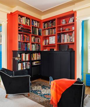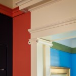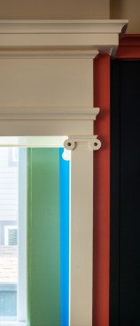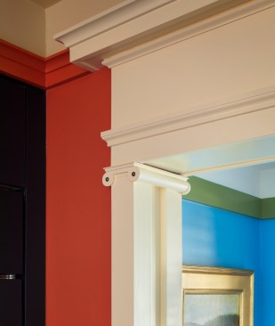 Throughout the room, paint is used as economical and essential compositional tool. Red and black both organize and animate the cabinetry, while the depth of the bays is accentuated with a cooler palette of green and blue. The contrasting whitewashed aedicules act as gateways between the two chromatic worlds. The ionic aedicules and intense color palette is inspired by Pompeian wall paintings.