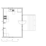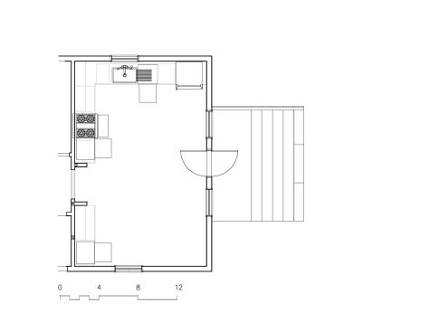 The kitchen is comprised of a primary volume with three recessed bays containing the windows and doors. These bays are framed by attenuated Ionic aedicules. Renovated on a tight budget, the unconventional use of stock molding profiles achieves a custom look. The necessary cabinetry and appliances are minimally articulated so that the architecture of the bays advances to the foreground.