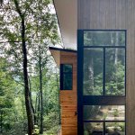 Round Mountain Falls, located in Rosman, NC, is a u-shaped floor plan organized around a parking court at the end of a driveway up a narrow ridge. The lot has a private waterfall, which is audible, but not visible, after you park your car and approach the front door at the elbow of the floor plan. It is not until you walk through the front door that the waterfall is seen catty-corner across the living room through a 20ft tall glass corner window. The concept for the house is a large boulder you find on a hiking trail obstructing your view of cascading falls. The house creates great anticipation until the jewel of the lot is revealed.