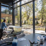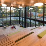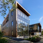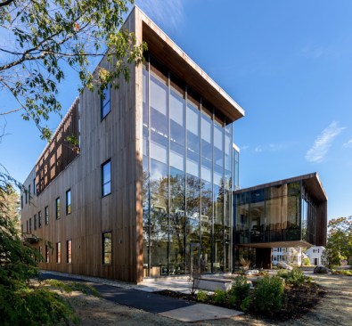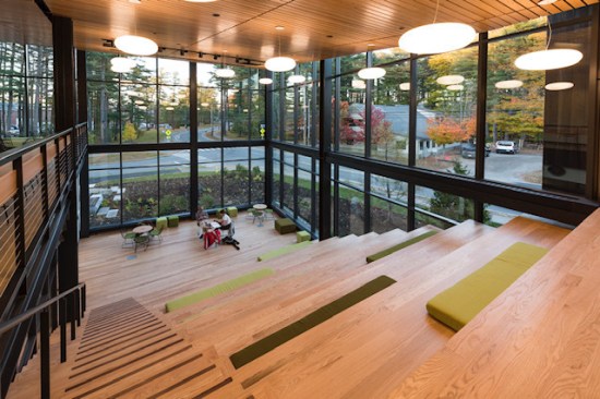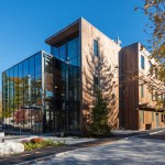 The LEED Platinum building (the highest rank on campus) includes a number of key sustainable initiatives including a PV array, a green roof, water reclamation and innovative building materials. More specifically, the building is clad in renewable FSC Poplar grown in Virginia, that has been thermally modified, a method only available in the U.S. over the last 5 years and rarely used on the East Coast. The wood is maintenance free, requires no treatment, and will turn silvery grey over time, just like cedar shingles on so many Maine barns and boat houses. The interior of the building is filled with Red Oak wood, sourced locally from Maine.