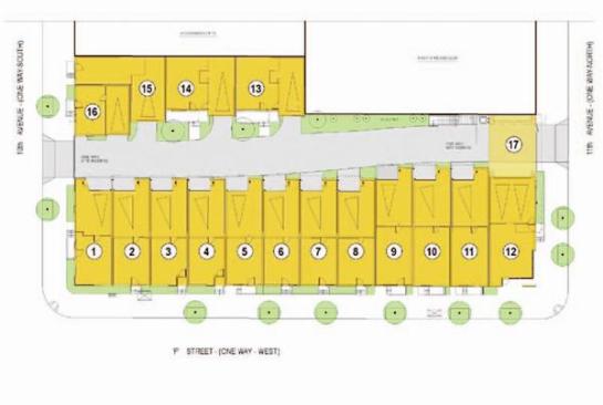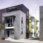 What started out as a series of defensive moves became selling points in the design of this speculative infill project. Architect Kevin DeFreitas wanted to avoid a condo project in downtown San Diego, fraught with lawsuits brought by homeowner associations, yet maximize the number of dwellings on this pricey piece of land. The solution: walls of tilt-up, 5-inch-thick concrete panels. They have 3 inches of airspace between them, qualifying the project for single-family status. At 16 feet, 4 inches wide, three row houses were shoehorned onto each 50-foot-wide parcel, achieving a density of 42 units per acre.