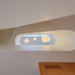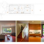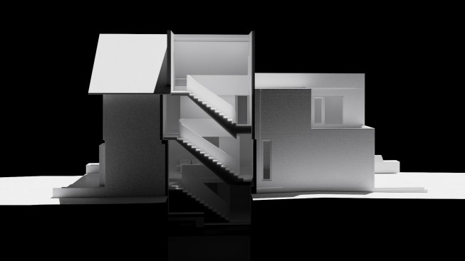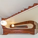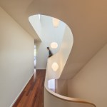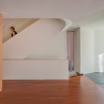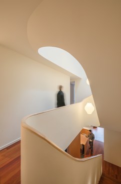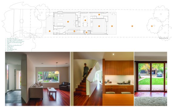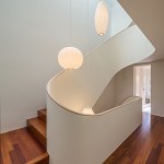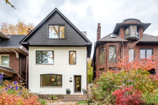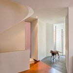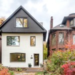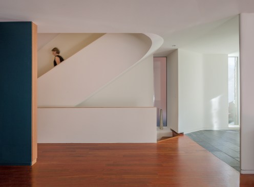 This renovation project was for a family who endeavoured to find a home that would exist seamlessly in a traditional neighborhood, yet exude a decidedly modern presence. They asked for a study of contrasts, not only oppositions in style and form, but also in the color palette, citing a love for the contrast of black against white.The existing home was a poorly renovated residence in a vibrant and handsome Toronto neighborhood. Beginning at the front elevation, every effort was made to produce open and airy family-oriented spaces out of what was previously a cluster of small and awkward rooms. By removing the deep covered porch and opening the entry and living room to dappled southern light, the front rooms that were once dark now embody the fresh simplicity of the painted white façade. The new arrangement of enlarged rooms required a relocated main stair to not only provide light to the center spaces, but to serve as the hinge for the Janus-faced project. The center-piece curved stair, which carves a substantial space through the house from the basement to the third floor, operates as an extension of the large skylight above. By funneling light through the center of the house this generous space, in a fairly narrow 24′ wide lot, becomes a ‘vertical room’ in the house, growing in width as it rises to the third floor. The space allows not only light and air to vent through the operable skylights, but visual connections emerge between spaces on adjacent floors. The stair’s thin, 2” thick balustrade was built-up of cantilevered sheets of 3/8” plywood that were laminated on site and sheathed in drywall. The curves are all true semicircles that progressively tighten as they descend and form a complex geometry as they intersect with both the sloped and flat ceiling plates below each landing. The rear of the house was extended to provide a large eat-in kitchen and family room with a fully operable glazed exterior wall on the ground floor and a master suite above. The previous homeowners had installed a large concrete swimming pool and deck, nearly filling the rear yard. By removing the mass of concrete and replacing it with a simple wood deck and garden, the space opens visually and physically. Even with the enlarged building footprint, the green spaces in this project have been more than doubled. The interior palette was kept quite simple with a dark Jatoba floor in the living spaces and black slate in the entries and kitchen. These rich colors contrast the crisp white walls and the light woods such as Douglas Fir and Birch that were used in the kitchen and bathroom millwork. A similar palette exists at the back of the house on the new elevation. Volumetric rooms with large expenses of glass present a modern façade in the same white as the front, but here they are detailed with Sapele windows and trim.
