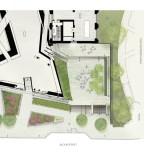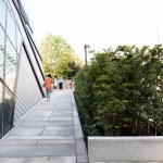 The soft Algonquin limestone of the terrace and the gently curved edges of the benches surrounding planting beds lush with trees and biodiverse gardens provide much needed public gathering and seating space in the heart of the city. The terrace, elevated off of Bloor street and nestled beneath the west side of the Crystal, provides a sheltered area for outdoor performances and connects to the greenery of Philosopher’s Walk.