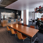 Designed to foster both recruitment and retention, the new space plays heavily on technology and experience. Designed to optimize flexibility in the workplace, the highly-social space is a framework for creativity and customization. The large, centrally located team space offers staff and visitors the opportunity to lounge, meet, eat, and of course, play video games. Custom communal tables with oversized casters and modular soft seating can be easily reconfigured for different events. A conference room with sliding tinted glass panels can be opened onto the area to expand the space for large gatherings. Very large open workspaces sit adjacent to enclosed audio-visual suites, providing distinct environments for different types of work.