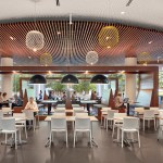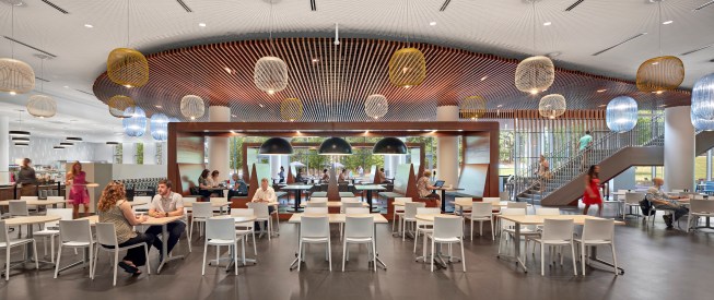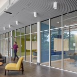 The six-story office building, the largest on the campus, features a variety of collaboration spaces for colleagues, visitors and business and university research partners including a collaboration center, a new cafeteria with outdoor garden seating and a 300-person multipurpose space. The ground and second floor levels are the most public and allow for impromptu encounters among colleagues and visitors. Second floor collaboration and meeting spaces are open to everyone on campus. The heritage center highlights the institution’s history and achievements. A terrace overlooking RTI’s softball field and the landscape beyond encourages a connection to the outdoors for occupants. An adjacent, four-story parking structure provides approximately 650 spaces. The new headquarters building offers many amenities for staff and visitors while serving as a central gathering place for events and collaboration at RTI.