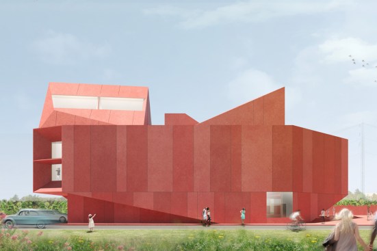 The design presents a two-story structure with an exterior clad in crimson-hued