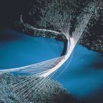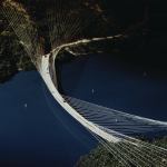 The bridge was designed to span the American River in California, about 10 miles upstream from a planned dam. The challenge was to connect roads running parallel to the steep valley walls without requiring the extensive and costly re-grading required for a straight bridge, and a curved span with customary vertical supports was ruled out by the 450-foot depth of the anticipated reservoir. Hence the “hanging arc” concept for the bridge, with a curved concrete deck supported by 80 post-tensioned cables anchored in the slopes of the gorge.