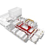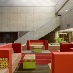 The interior material palette features rich reds and oranges to act as a counterpoint to the existing terrazzo, concrete, and brick. Recycled wood pulp panels were utilized at millwork and wood ramps. The carpet tiles were selected to add color and texture to the spaces as well as for the maximum use of recycled content. The furniture colors and fabrics were selected for their design impact as well as for their recycled content and their “cradle to cradle” certification.