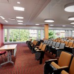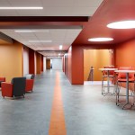 The purpose of this project was to convert one of the first buildings constructed on the Rutgers University Livingston Campus (a former dining hall) into a classroom building. The existing concrete structure was designed by Anderson Beckwith and Haible in the late 1960’s and as with many buildings of that time period, it features very durable finishes such as terrazzo, interior brick, and exposed aggregate poured in place concrete. While the existing finishes have endured over 40 years of use, the lack of color and adequate lighting resulted in dark, dreary spaces. The building had become one of the least popular buildings on campus (earning it the nickname of “Kazakhstan”).