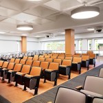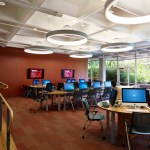 The design approach was to introduce colors, textures, and lighting that would enhance the best features of the existing building, with as little intervention as possible. The new building program includes over seventeen classrooms and lecture halls, new breakout and lounge areas, computer labs, academic support spaces, and a renovated central postal facility. The existing concrete waffle slab floor structure was exposed in most classroom spaces and lit dynamically with pendent lights. Classroom spaces were organized around the perimeter of the building to maximize daylighting and views and to reduce the amount of lighting load throughout the day. The relatively low ceilings of the corridors were disengaged from the walls so that the building utilities are accessible but out of view, and to provide an additional sense of space.