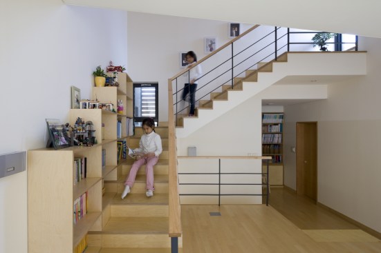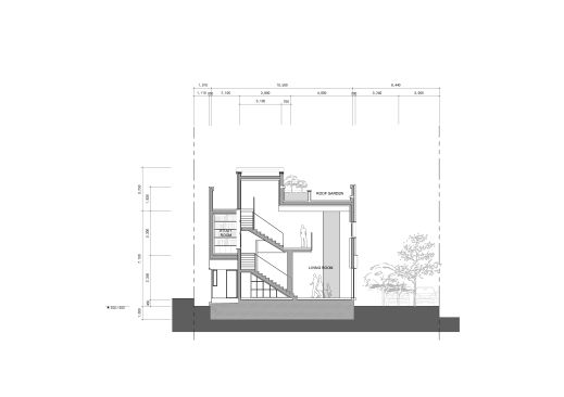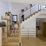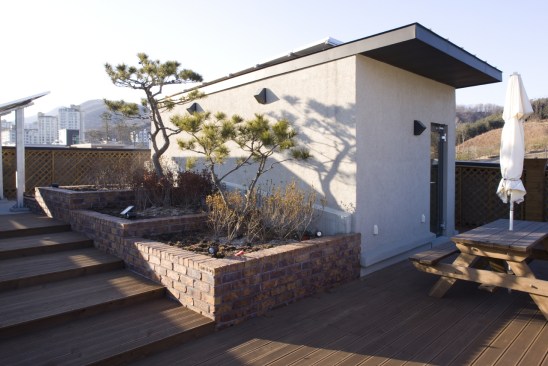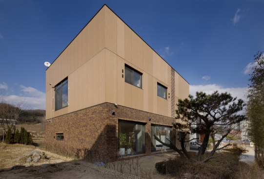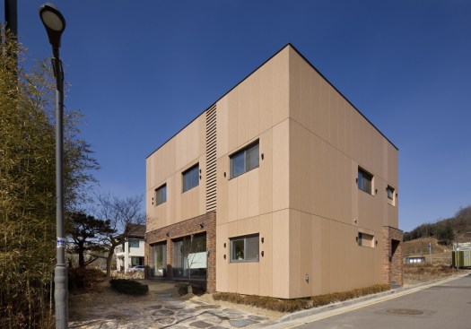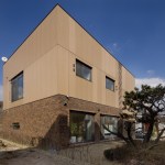 A bright, high density wood panels and clay bricks were used for exterior materials to go along with the S Family. Though the high density wood panels are expensive which even possesses 1/3 of the construction cost, the Client preferred a non-transformational, durable, high stain resistant material. Other materials were under consideration as well, but the high density wood was chosen for its consistent appearance for 30 years. The white paint and birch tree materials were selected for the main interior finishing materials to also fit the bright image of the entire family. A family park and vegetable garden was designed at the rooftop which blends into the sky.Written by Joon H. Park