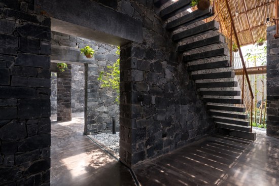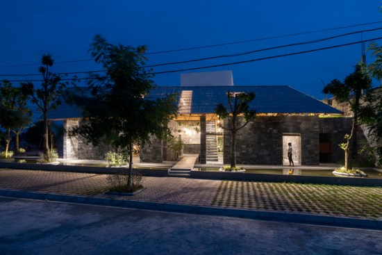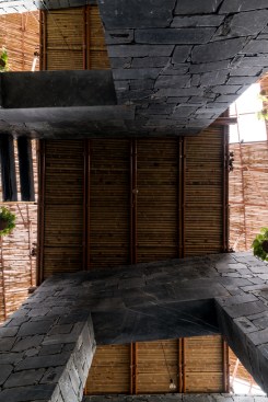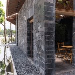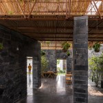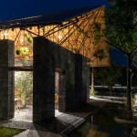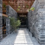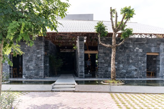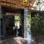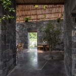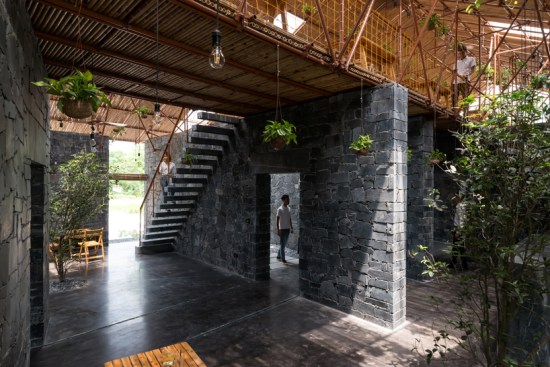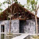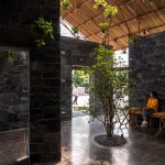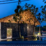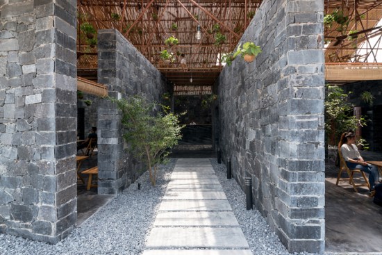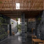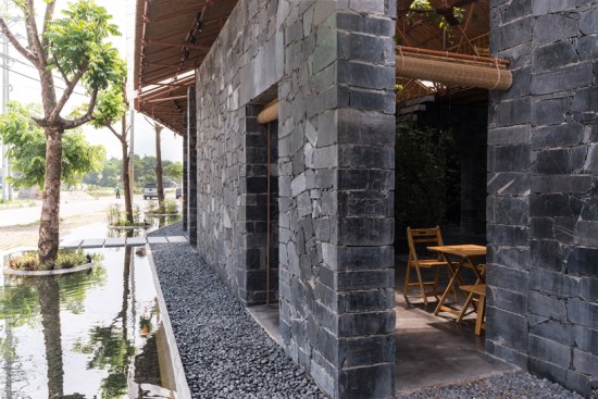 S SPACE (S = Save the Stone & Scaffolding) Not quite far from a large polluted industrial park, the project is located in a new emerging urban area with a high construction density in Dong Van town, Ha Nam province. This is an open space for the community with its focus on cultural and artistic aspects on a periodical basis, among which coffee space is a daily activity. The design inspiration comes from the beauty of the national landscape of Kem Trong situated between the two provinces of Ha Nam and Ninh Binh where illegal rock mining is gradually turning this famous place into ruins. From this perspective, the design concept is to make use of waste (reusing scaffolding steel pipes, collecting rock debris from Kem Trong, discarded rocks from trade villages and construction sites) to express the treasure, nostalgia / regret of local people at the bygones of the lanscape. Idea for design: The gap between two rocky mountains created by Day River “Mountains” are stone walls (0,4m thick, 3,4m high) which stand alone, zigzag intermittently and connect randomly to one another through doors and openings to enable users’ approach from various directions. The outer cover is the water surface; green trees alternate invarious positions with different elevations to regulate microclimate, create scenery and blur the outer-inner boundaries, bringing people closer to nature. Suspended above is a “Big cloud” consisting of lightweight roofs and mezzanine floors created by the continuous transfer of steel pipes (d = 4,2cm, previously used as construction scaffolding) together with bamboo sticks (roofing, flooring), all of which make a fragile but solid, elastic structure – in contrast to the thickness and tortuousness of the rock cave beneath. On top of the transparent polycarbonate roofing are sprinkler & mist sprayer to wash the roof and keep cool on hot summer days. “Clouds and Mountains” presents primitive and dream like images butat the same time evoke strange feelings when experiencing it on and within: dead metal trees and heavy polluted smoke are gradually swallowing the town,… Named as S Space (S = Save the Stone & Scaffolding), the project helps raise alert at unplanned exploitation of natural resources in Vietnam today, which have wiped out many rocks with historical and cultural values, resulting in a serious imbalance between the natural ecosystem and the human one. In this sense, the message S Space conveysis: “Architecture bears responsibility for the natural and social-cultural environment”.