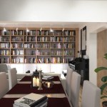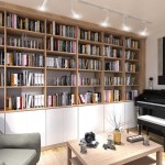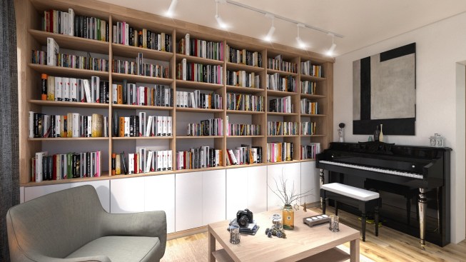 The nice piano owned by the host was placed next to the living room door. Since it was not desired to have a TV, a large bookcase was designed in the living room.