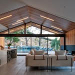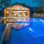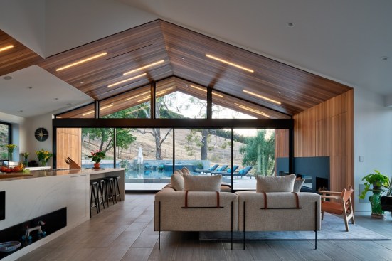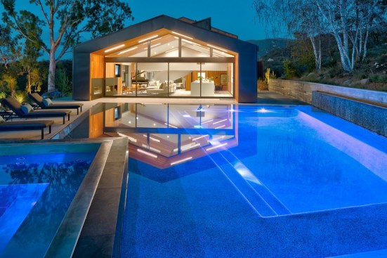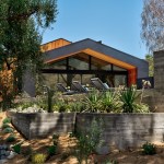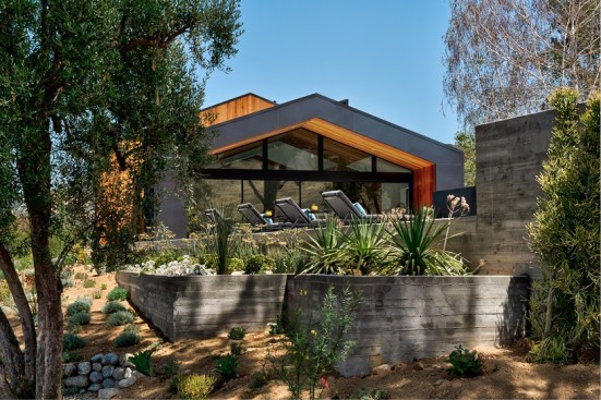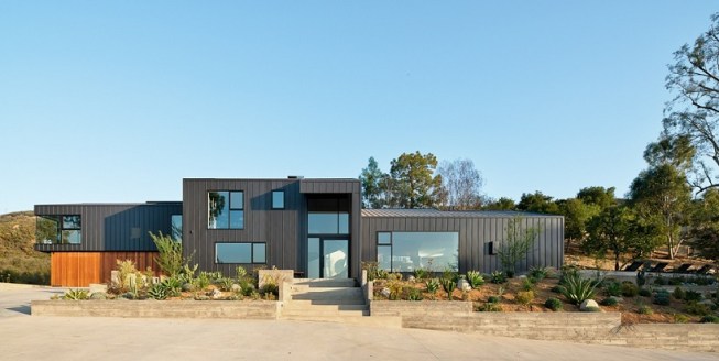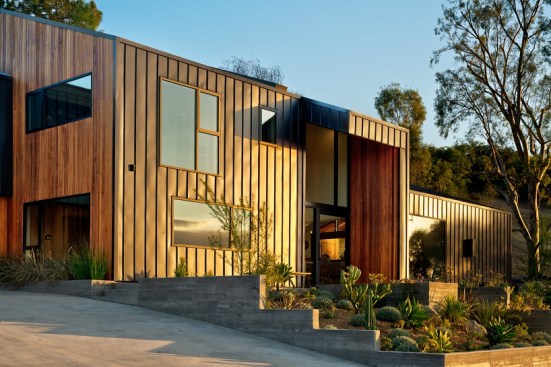 The design of this home arose out of a series of site challenges and constraints. The one-acre property and existing home sat within a protected area of the Santa Monica Mountains. New restrictions on development made it unfeasible to add anything outside the existing building footprint. The existing home had little architectural value: it was dark inside, and it had no contextual relationship to the site. Working within the existing footprint and rooflines, the design is a dramatic transformation from a generic tract house to a custom home that is responsive to its context and is a hybrid of modern ideals paired with conventional volumes. The small, dark interior rooms were replaced with an open floor plan. Large incisions were made to let in light, views, and to create an inside-to-outside connection. A composition of dark standing seam metal and vertical grain cedar is used to give the appearance that the building is three cut pieces shifted side-to-side (the wood being the cut face). The cedar siding also carries from outside to in, bringing warmth to the home and reinforcing the connection between exterior and interior. Sustainable features include both photovoltaic panels to create electricity and thermal panels for the pool and the thermally coupled HVAC system. This system makes it so that the residence can largely function off-the-grid. The site has a fire suppression system that uses the pool water, and is also landscaped using drought tolerant landscaping throughout.