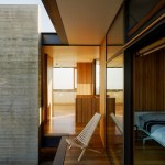 Steel wide flange beams, anchored to the inside face of each concrete wall, form floating horizontal slabs that support steel joists and conditioned air distribution. Communicating between these slabs, and frequently pulling in from the perimeter to form exterior decks, is a handmade enclosure of metal frames in-filled with wood and glass and solid wood interior partitions that define the home’s private and service spaces.