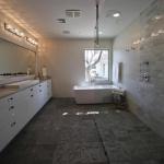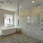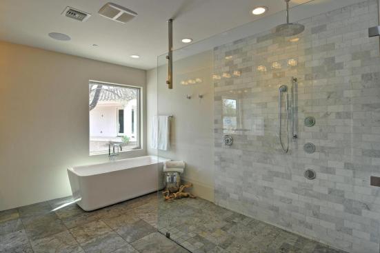 The master bath is finished with a beautiful mix of Bianco Carrara marble counters and shower with grey quartzite tile floors. A sleek with free standing tub positioned in front of a picture window is the centerpiece of the room. The shower features sever WaterSense labeled body sprayers and an overhead shower head for maximum relaxation.