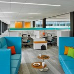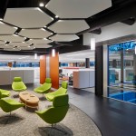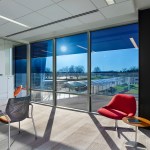 One of the largest building-material manufacturers and suppliers in the world, Saint-Gobain, along with its North American subsidiary CertainTeed, recently debuted a new North American headquarters in Malvern, Pa. The 320,000-square-foot facility sits on a 65-acre campus and is home to more than 800 employees across Saint-Gobain and CertainTeed. The new headquarters features open-plan office space, collaborative work areas, a cafeteria, gym, an outdoor pond and fountain, and walking trails. The company incorporated 40 of its own products—eight exterior and 32 interior—into the design, including 17,000 square feet of zoned electrochromic glazing from its SageGlass brand on the building’s façade.