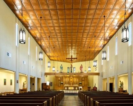 Before installing the new panels, they refinished the steel grid. “The thing is,” Fr. Dean explains, “that wood grain would not work with a white grid.” He decided to paint the grid in flat black, to complement the wrought-iron pendant lights. “I figured we’d just put a little spray paint up there. I didn’t know. We went through a couple of cases of spray cans.”