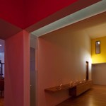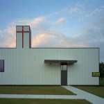 This project is the result of a transformation of an existing metal shop building into a sanctuary and fellowship hall in anticipation of a larger adjacent sanctuary on the same site. The simple original structure is enveloped by a new skin, obscuring and refining the original gabled form. Although a small structure, its bold form makes it visible and recognizable from the interstate which passes nearby.