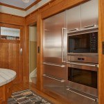 In contrast to all the wood, Christofferson used a pale quartzite on the counters and white subway tiles on the walls. Stainless steel appliances and cabinet hardware lend their own luster to the space, as do the milky iridescent hand-blown glass shades of the lighting fixtures.