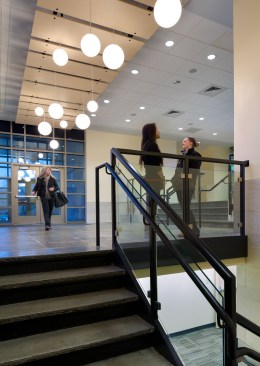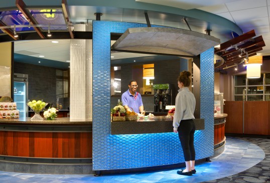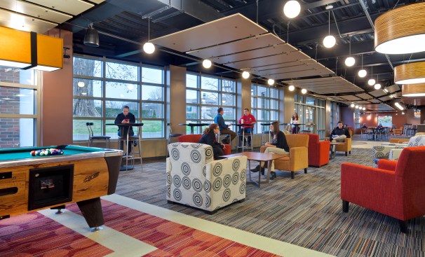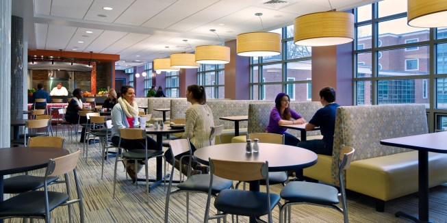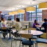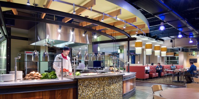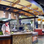 Salve Regina needed to be transformed. Located in the heart of Newport Rhode Island’s Bellevue Avenue Historic District, the University recognized the need to modernize its outdated facility to help it complete with peer Universities and foster increasing student social interaction. The solution was a completely redesigned and expanded facility and board plan that was to become a destination dining experience. The focus of the new 12,000 –sf, 2 story building was a dynamic dining and student life facility that included a student lounge and expanded dining areas. The redesigned flowing floor plan features display cooking – putting the chef and food at the center of attention. With the cooking activities out from “back of house”, individually designed menu stations create a market-style experience – with on-demand food preparation. The rich textures of surrounding Newport became the language of inspiration in forms and finishes that were selected. The result is a dynamic, relaxed destination experience where food takes center stage.