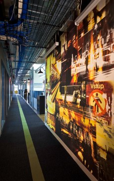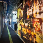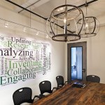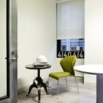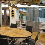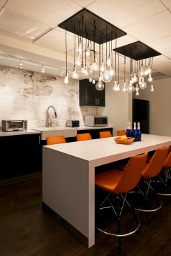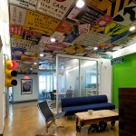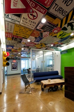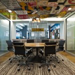 Faced with escalating rents in their increasingly popular Houston Street neighborhood in New York City, and a rapidly growing roster of employees, leading traffic and transportation planning and engineering firm Sam Schwartz Engineering (SSE) decided it was time to relocate to a more affordable space – one that would provide room to grow as a company and inspire a transition to a more collaborative, open work environment. The design of their new space brings the firm’s work to life by incorporating materials from the streets into the office design, creating a kitschy vibe that well reflects SSE’s fun-loving corporate atmosphere. Design elements include a one-of-a-kind reception desk created from railroad ties; a lobby ceiling densely covered in traffic signs; traffic lights used to signal conference room occupancy; silhouettes of pedestrians painted on office walls; and painted stripes on the carpet to create the sense of a roadway in the office’s high traffic areas. To create a more collaborative atmosphere, the few private offices all have glass fronts and exit into the open office area, ensuring all employees are within close proximity to each other. Benching solutions were used to encourage collaboration and allow for flexibility as SSE increases or reduces density. Bench areas are separated by unique sliding cubby units that can be moved closer together to create an extra workspace for a new hire. To stay on budget – while still creating a dynamic, functional space – SSE’s design firm used a variety of alternative design methods, including electrical conduit screens that function as privacy barriers while simultaneously carrying power and data versus running electrical wiring under the floor, and using crates to create “walls” between office areas that also provide storage.