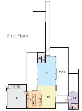 To mitigate traffic noise Segal wrapped the north side of the building complex, where he located guest quarters and a lap pool, with an unbroken 9-foot-high wall faced with Cor-Ten steel. To the south, where the lot borders a quiet residential street, a solid 9-foot hedge encloses a private garden. By means of nesting glass doors, the ground-floor great room opens almost entirely to the lap pool on one side and the garden on the other. Isolated from the world outside, indoor spaces spill out into these protected outdoor zones. Atop the main level, a plaster-clad box contains two additional floors of bedrooms and private living spaces, which take in more distant views.