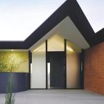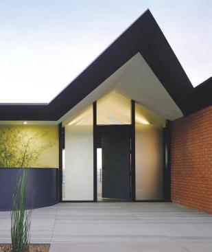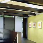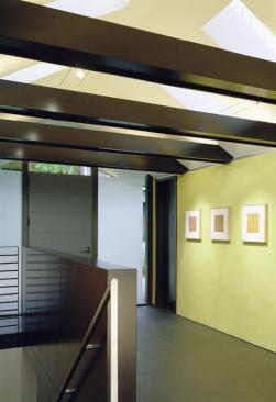 Stripping away layers of clashing materials that had built up during earlier renovations, Mankins applied sophisticated matte-finish materials and colors that balance the house’s more dramatic gestures. The original street elevation featured a pair of wood entry doors and more than 20 slender panes of glass in a fussy, asymmetrical arrangement that distracted from the projecting roofline above. Mankins’ radical simplification—a single door surrounded by large panels of frosted glass—gives the entry the sense of drama and surprise one suspects the original was reaching for. The kitchen is a stringently simple composition of flush cherry cabinets with counters and backsplashes of honed English slate. A flamed version of the same stone covers the floor in all but the bedroom areas. Casework and wood trim wear a deep coffee-color stain that contrasts with the rich yellow of the artisan plaster walls. Metal accents—railings, door hardware, and the fireplace surround—are brushed stainless steel.