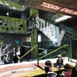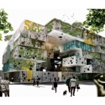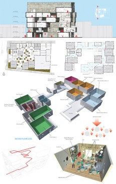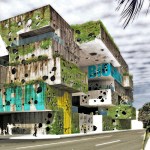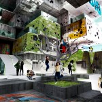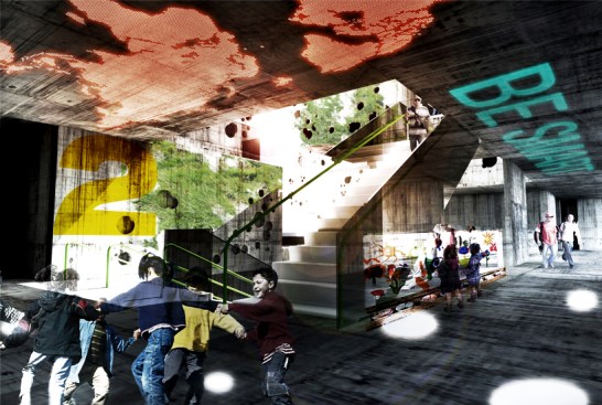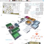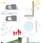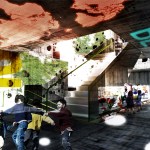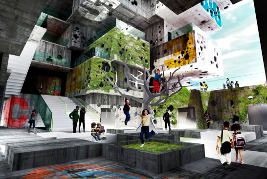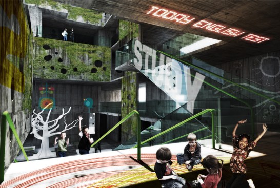 The filtering occurs at every level. The building re-uses the rain water to maintain the walls wet for the green slime texture keeping the heat controlled from outside. A singular window in a classroom becomes an opening to the outside world. The pattern created by these openings – in walls, roofs, and floors – can be operated by the students for their use in order to manipulate light, air and views. The classroom is a controlled environment where the didactic experience is a focused one. Once outside the classroom the building itself becomes a sponge, filtering the outside towards the inside.