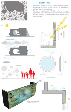 The archetype created by the pattern of opening is a trema disk, a fractal texture constructed through the exhaustive removal of circular pieces. The term refers to the removed pieces. The size of each trema is calculated using an inverted logarithmic scale. If successfully constructed, the trema field will maintain a consistent fractal dimension at any viewing scale. At the same time it provides a porous skin to the school giving it the appearance of a sponge.