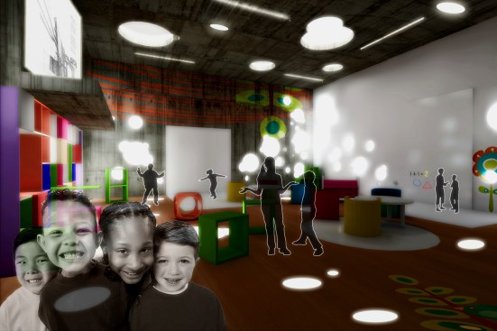 The halls outside the classrooms serve as patios or terraces. Places that encourage encounters with other students, faculty and the community. The walls, roof, and floors in these covered exterior areas serve as projection surfaces where digital images of photographs and texts inform students of mathematical equations, symbols, news and events. These spaces become didactic and entertaining places.